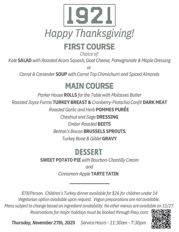 Please join our 1921 family for Thanksgiving Day dinner service! We are serving a traditional Thanksgiving dinner from 11:30am-7:30pm.